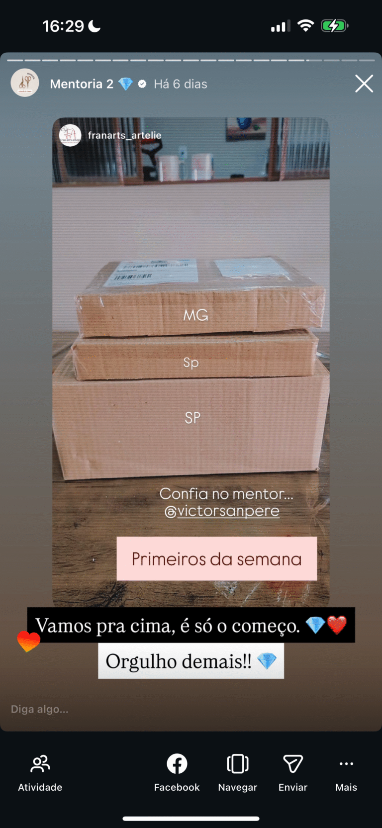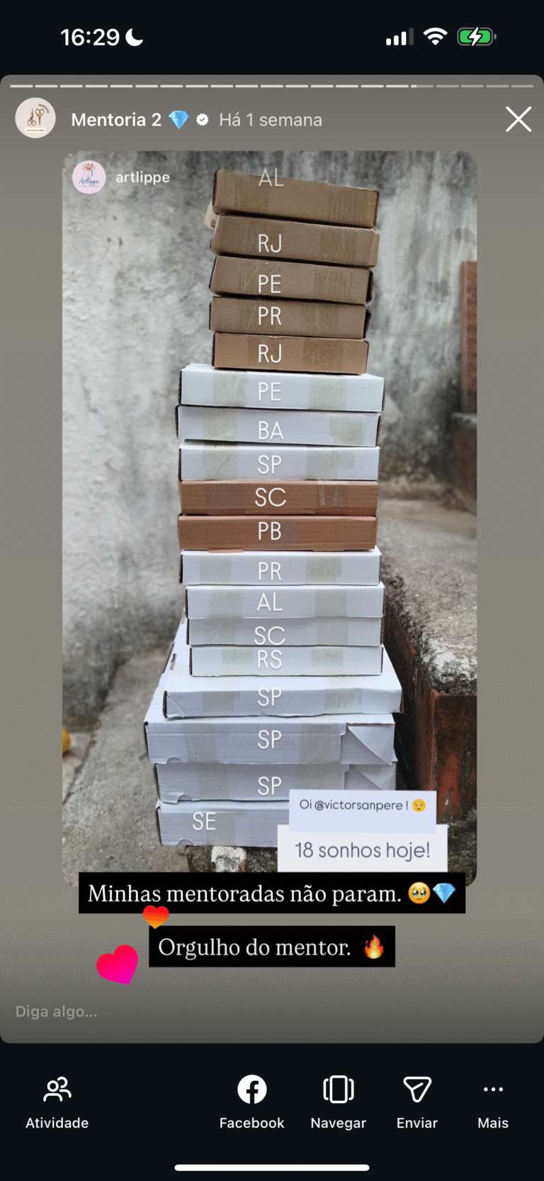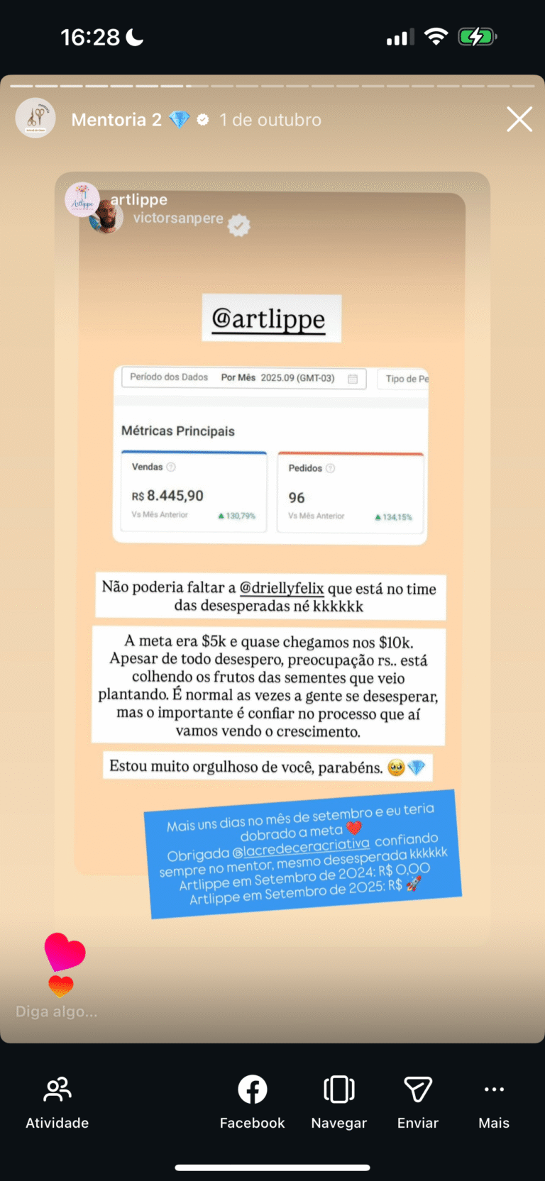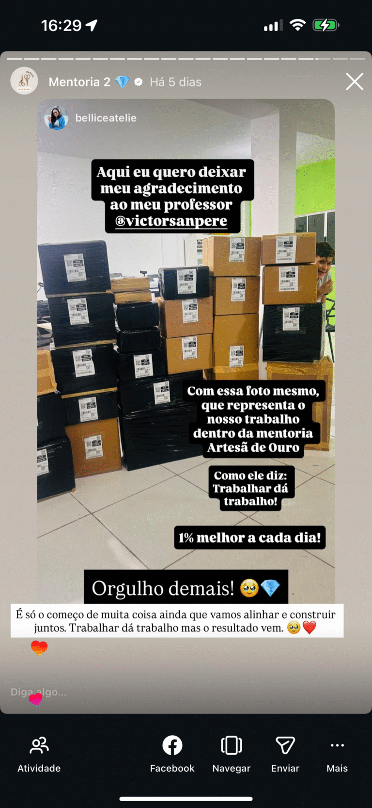 Victor Pereira é filho de calígrafa com gráfico, começou aos 12 anos criando convites com o pai. Aos 20, já trabalhava com design e marketing. Criou o maior acervo de lacres de cera do Brasil, montou uma gráfica com a esposa e, após um momento de virada pessoal, passou a ensinar artesãs a vender de forma profissional. Hoje lidera a Mentoria Artesã de Ouro, com histórias reais de transformação.